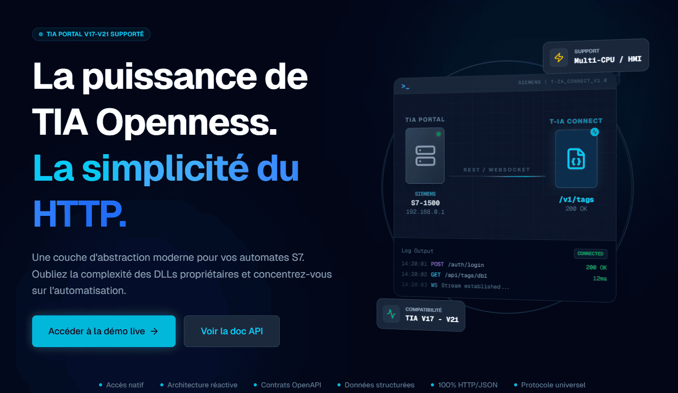 En transformant les librairies complexes de TIA Openness en une API REST universelle, ces outils permettent aux automaticiens de piloter TIA Portal sans écrire une seule ligne de C#, ouvrant ainsi la voie à l'utilisation de langages web modernes et surtout, à l'Intelligence Artificielle.